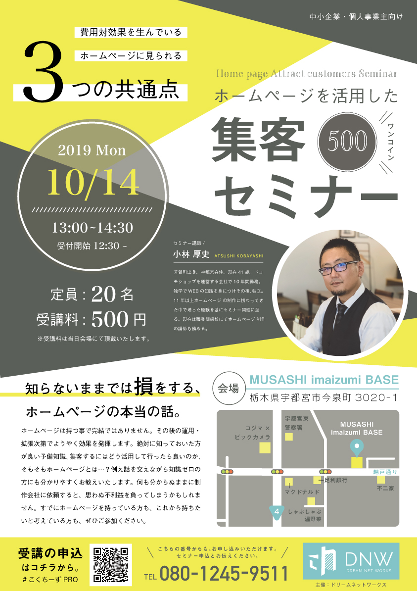 こんにちは。 代表・エンジニアの小林です。 10/14(月) MUSASHI imaizumi BASE にて集客セミナーを行いました。台風直後で通行止めの所もあり、生憎の雨の日でした…
